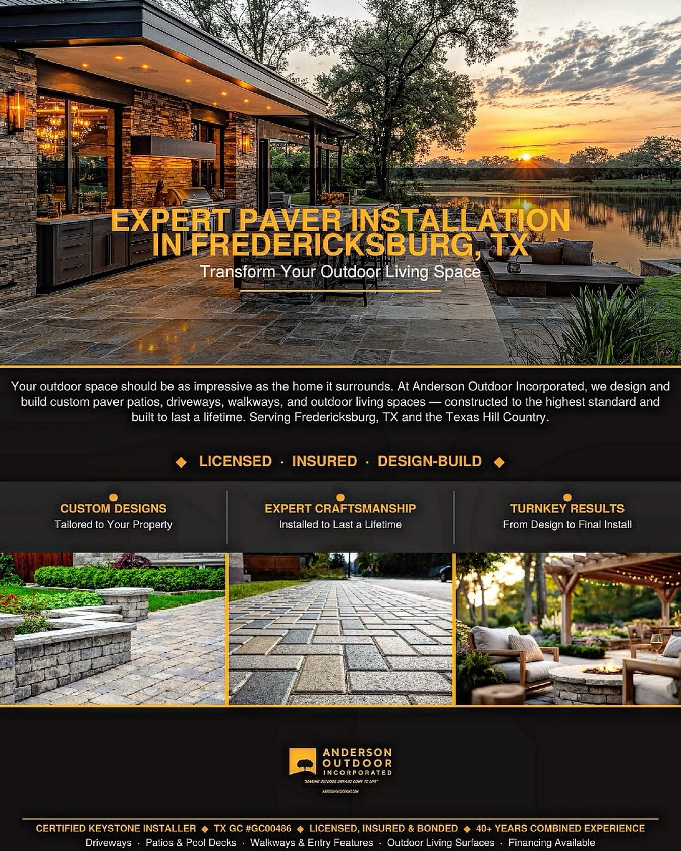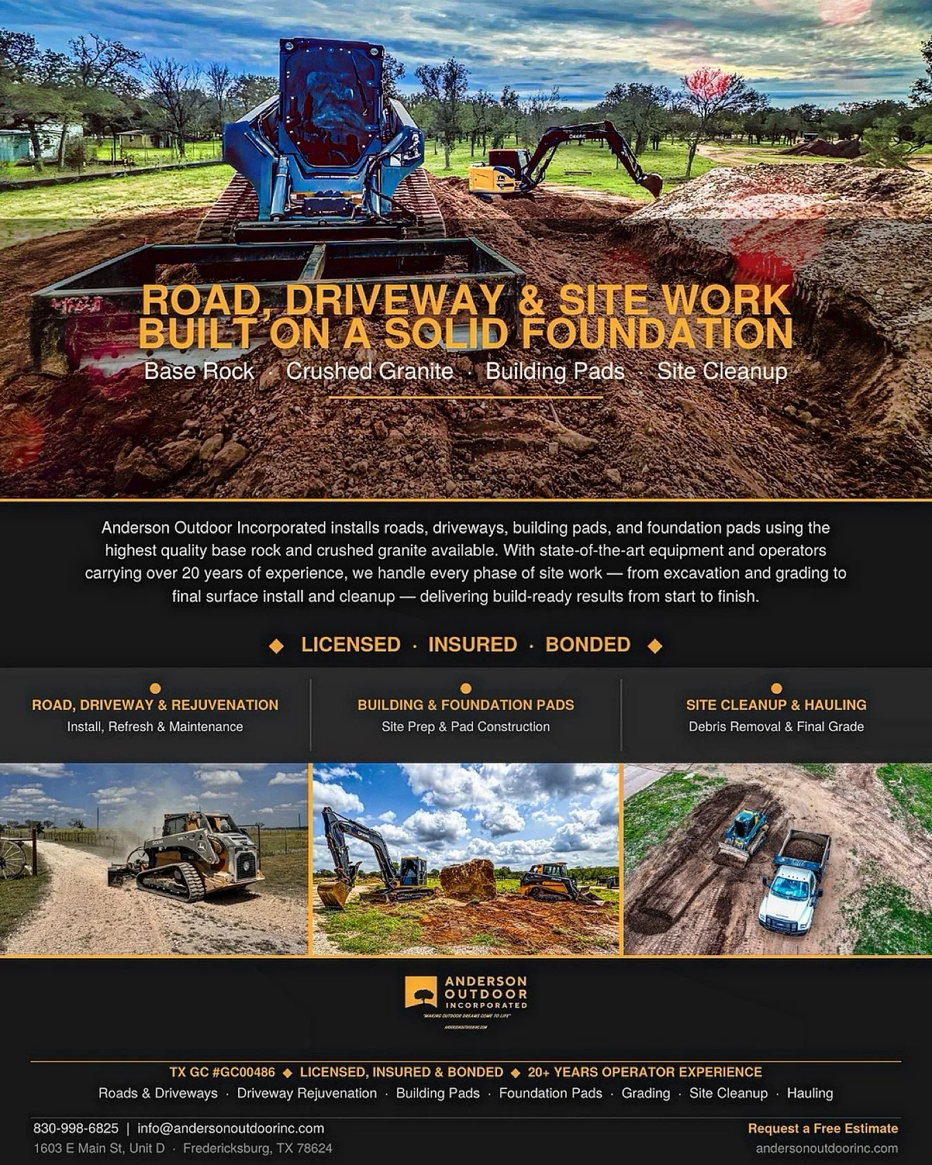 Our project highlight videos give you a behind-the-scenes look at the quality, equipment, and workmanship that define Anderson Outdoor Incorporated. From land clearing and excavation to pavers, landscaping, and full outdoor transformations, see how our team turns vision into reality across the Texas Hill Country.